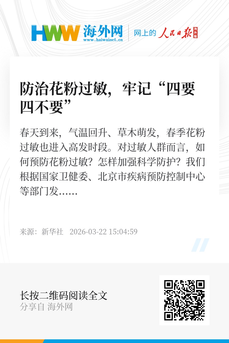 春天到来,气温回升、草木萌发,春季花粉过敏也进入高发时段。对过敏人群而言,如何预防花粉过敏?怎样加强科学防护?我们根据国家卫健委、北京市疾病预防控制中心等部门发布的相关提示,梳理了防治花粉过敏的“四要四不要”,跟随海报一起了解。