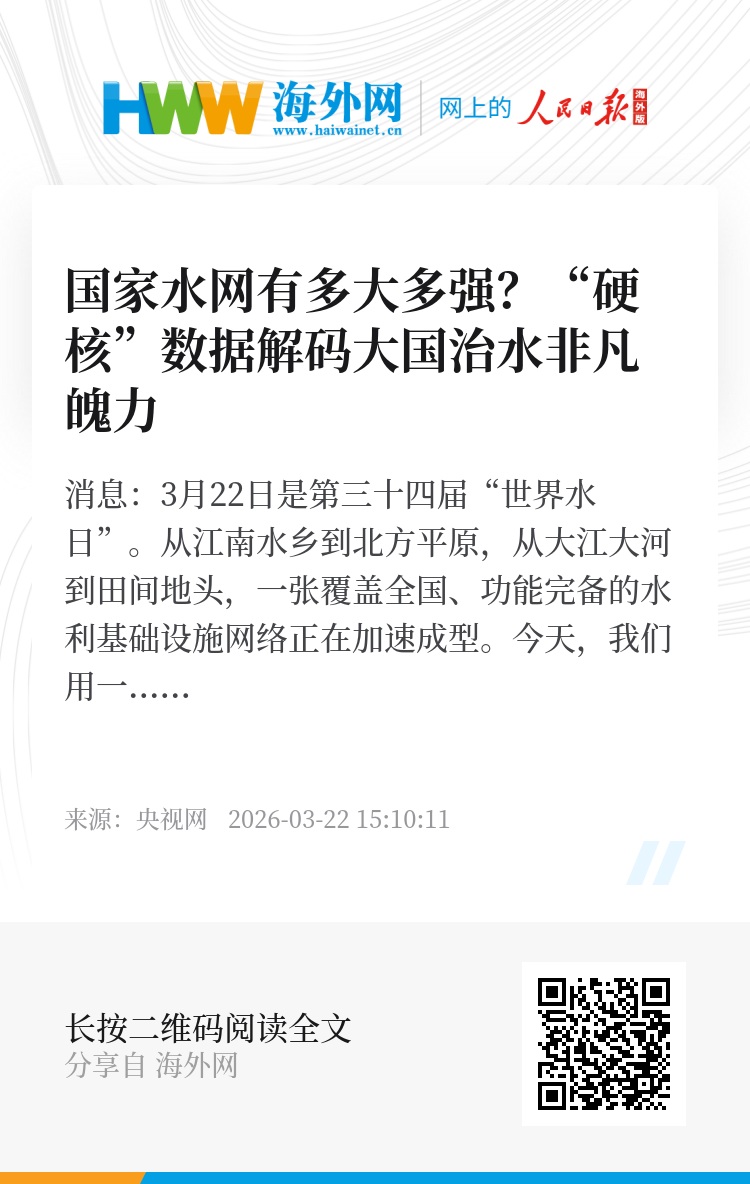 央视网消息:3月22日是第三十四届“世界水日”。从江南水乡到北方平原,从大江大河到田间地头,一张覆盖全国、功能完备的水利基础设施网络正在加速成型。今天,我们用一组组“硬核”数据解码大国治水的非凡魄力。