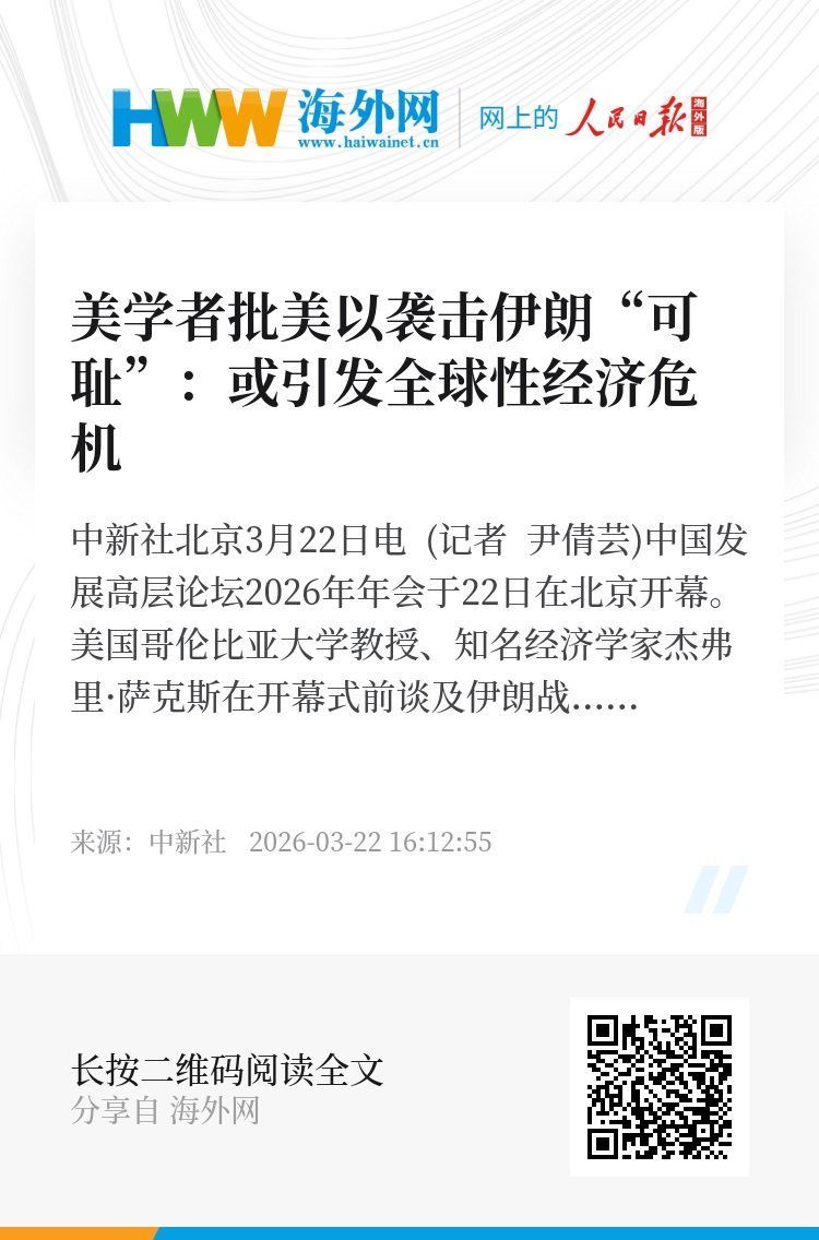 中新社北京3月22日电 (记者 尹倩芸)中国发展高层论坛2026年年会于22日在北京开幕。美国哥伦比亚大学教授、知名经济学家杰弗里·萨克斯在开幕式前谈及伊朗战事时称,这是美国和以色列发动的一场“可耻的战争”,将严重冲击世界经济,但对中国的影响有限。