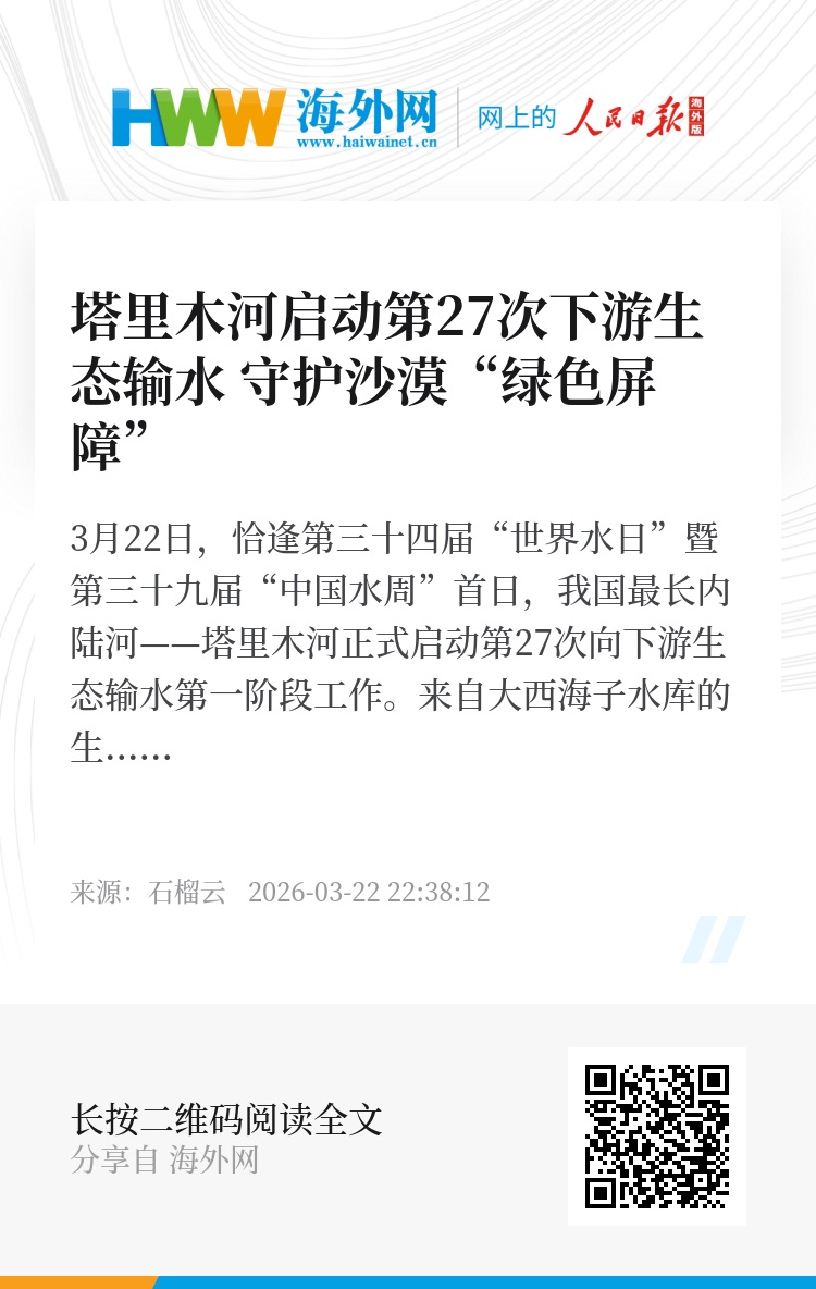 3月22日,恰逢第三十四届“世界水日”暨第三十九届“中国水周”首日,我国最长内陆河——塔里木河正式启动第27次向下游生态输水第一阶段工作。来自大西海子水库的生态水奔腾而下,顺着河道蜿蜒流淌,为下游沿岸胡杨、红柳等植被送去春日滋养,持续巩固塔里木河下游“绿色走廊”生态成果,为沙漠边缘的生态复苏注入新动能。