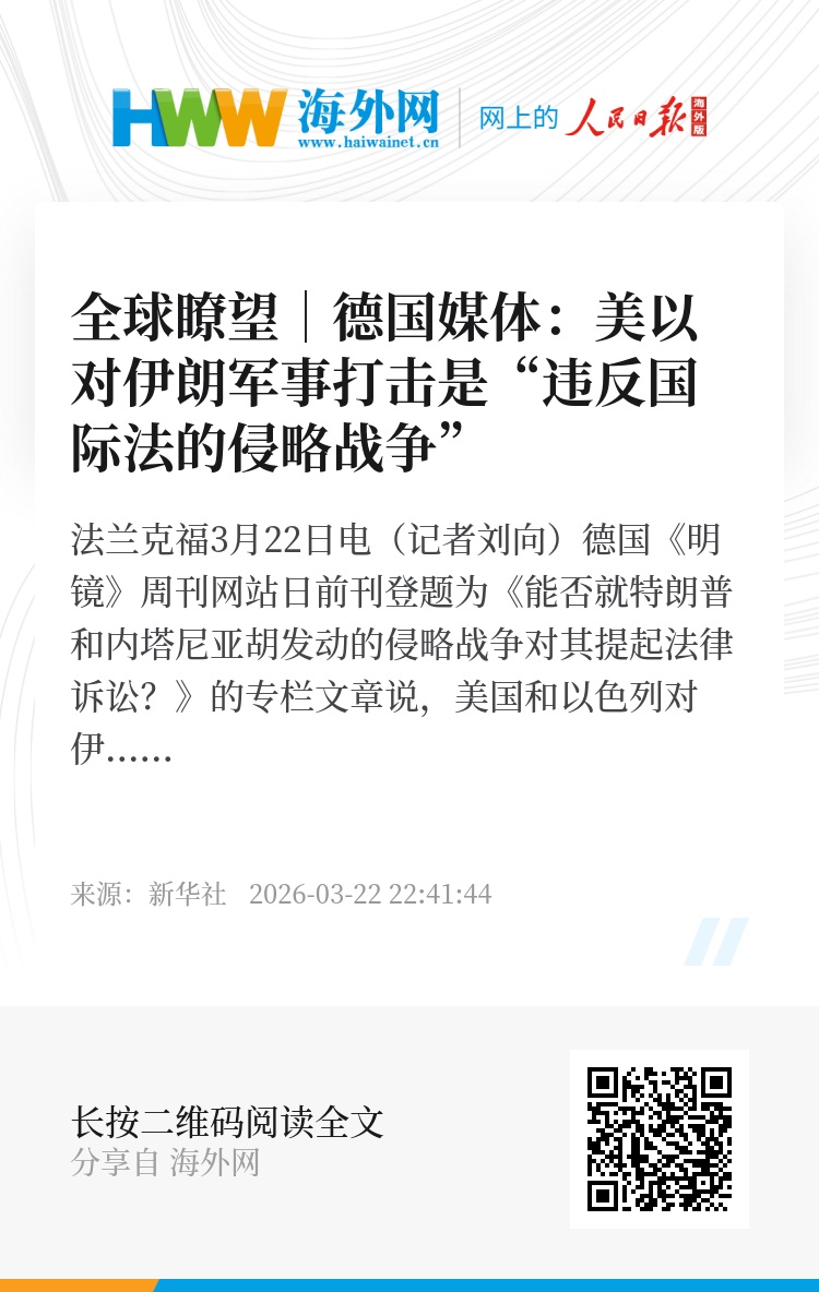 新华社法兰克福3月22日电(记者刘向)德国《明镜》周刊网站日前刊登题为《能否就特朗普和内塔尼亚胡发动的侵略战争对其提起法律诉讼?》的专栏文章说,美国和以色列对伊朗发动的军事打击是一场“违反国际法的侵略战争”。文章摘要如下: