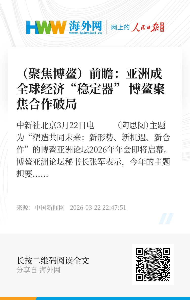 中新社北京3月22日电 (陶思阅)主题为“塑造共同未来:新形势、新机遇、新合作”的博鳌亚洲论坛2026年年会即将启幕。博鳌亚洲论坛秘书长张军表示,今年的主题想要传递一个信息:世界大变局既充满挑战也蕴含新机遇,要坚定信心,在挑战中开创机遇,在合作中实现共赢,携手打造更加美好的未来。