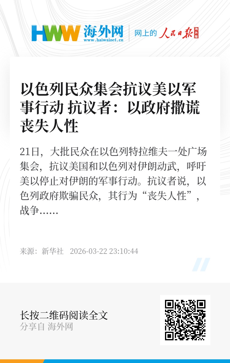 21日,大批民众在以色列特拉维夫一处广场集会,抗议美国和以色列对伊朗动武,呼吁美以停止对伊朗的军事行动。抗议者说,以色列政府欺骗民众,其行为“丧失人性”,战争只会让无辜民众丧失性命,希望以和平方式解决问题。