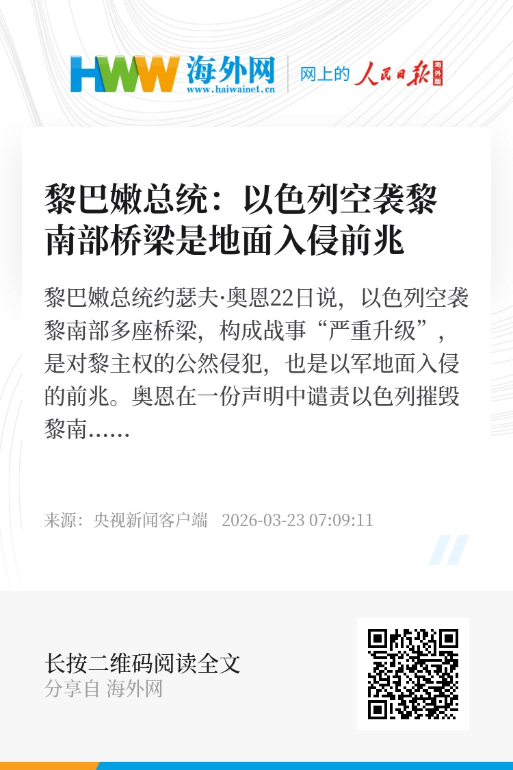 黎巴嫩总统约瑟夫·奥恩22日说,以色列空袭黎南部多座桥梁,构成战事“严重升级”,是对黎主权的公然侵犯,也是以军地面入侵的前兆。