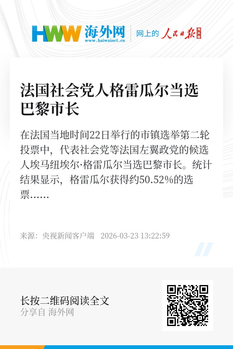 在法国当地时间22日举行的市镇选举第二轮投票中,代表社会党等法国左翼政党的候选人埃马纽埃尔·格雷瓜尔当选巴黎市长。