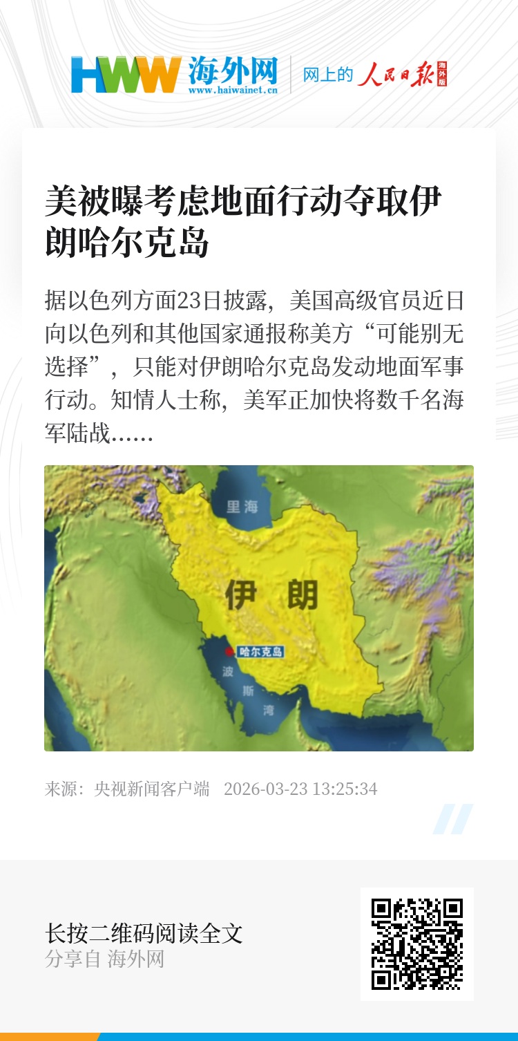 据以色列方面23日披露,美国高级官员近日向以色列和其他国家通报称美方“可能别无选择”,只能对伊朗哈尔克岛发动地面军事行动。