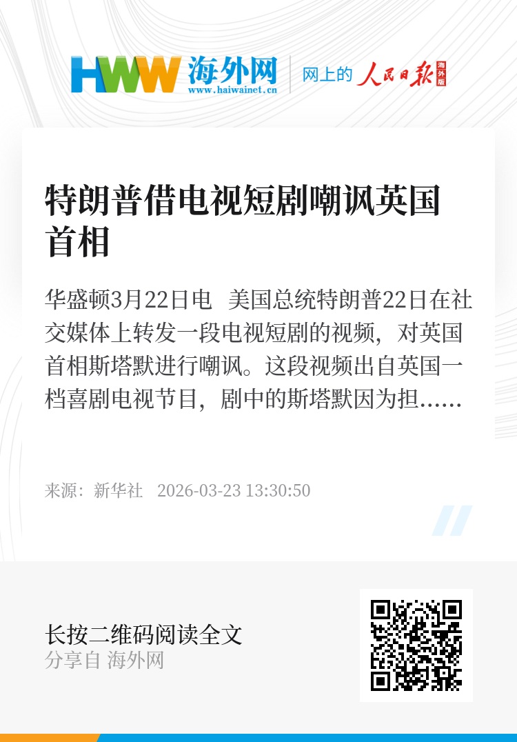 新华社华盛顿3月22日电 美国总统特朗普22日在社交媒体上转发一段电视短剧的视频,对英国首相斯塔默进行嘲讽。
