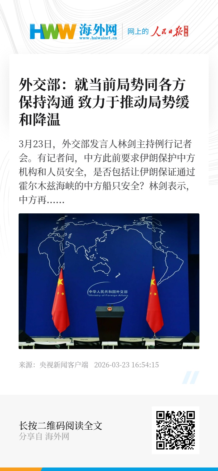 3月23日,外交部发言人林剑主持例行记者会。有记者问,中方此前要求伊朗保护中方机构和人员安全,是否包括让伊朗保证通过霍尔木兹海峡的中方船只安全?
