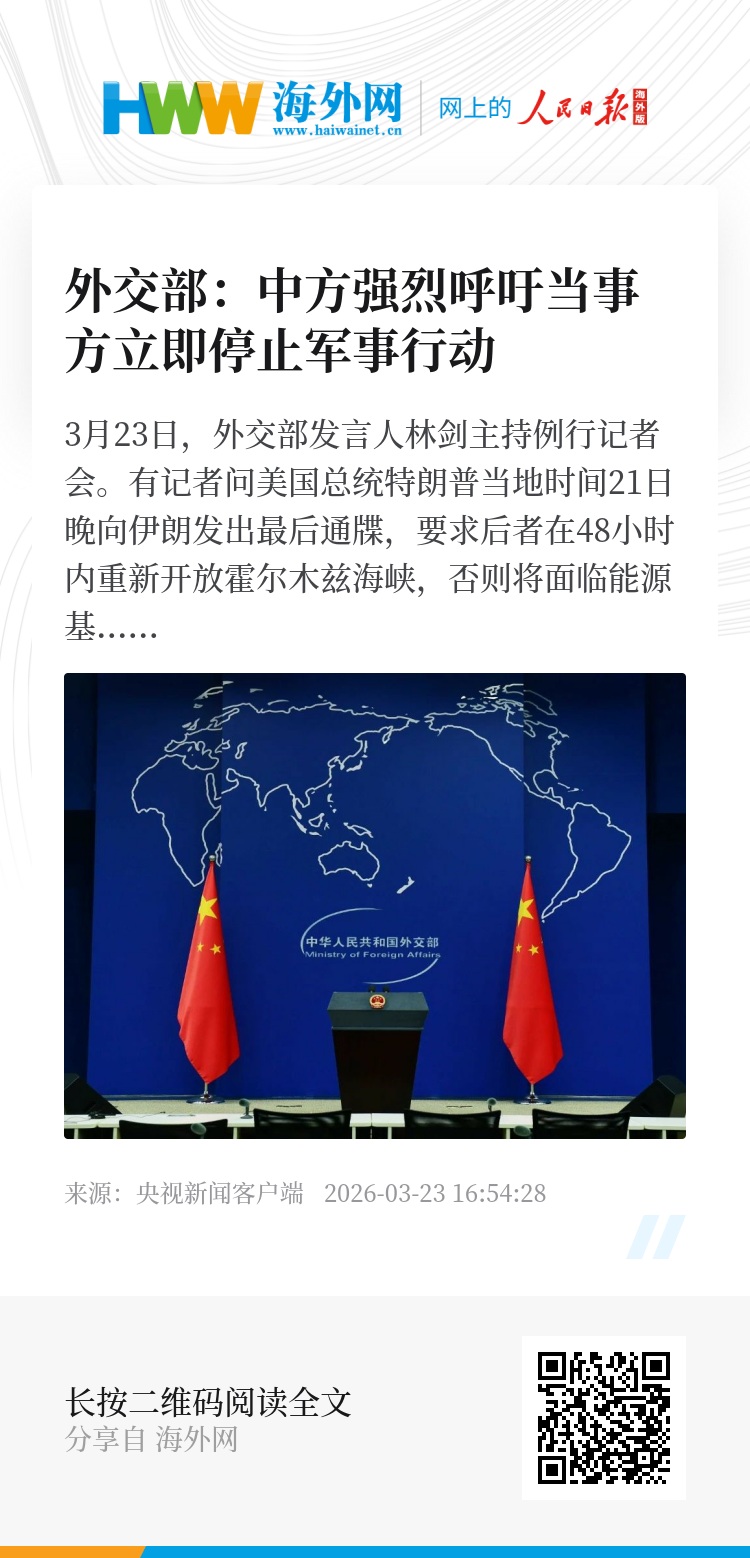 3月23日,外交部发言人林剑主持例行记者会。有记者问美国总统特朗普当地时间21日晚向伊朗发出最后通牒,要求后者在48小时内重新开放霍尔木兹海峡,否则将面临能源基础设施被摧毁的风险。中方对此有何评论?