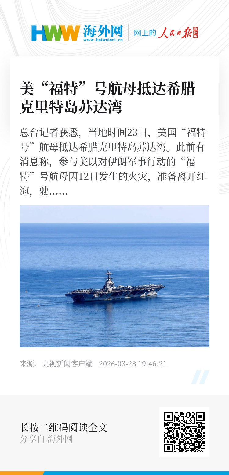 总台记者获悉,当地时间23日,美国“福特号”航母抵达希腊克里特岛苏达湾。