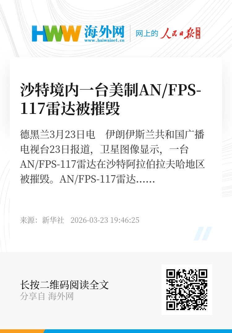 新华社德黑兰3月23日电 伊朗伊斯兰共和国广播电视台23日报道,卫星图像显示,一台AN/FPS-117雷达在沙特阿拉伯拉夫哈地区被摧毁。