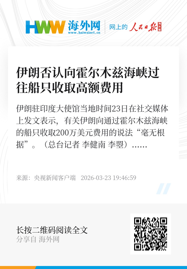 伊朗驻印度大使馆当地时间23日在社交媒体上发文表示,有关伊朗向通过霍尔木兹海峡的船只收取200万美元费用的说法“毫无根据”。(总台记者 李健南 李曌)