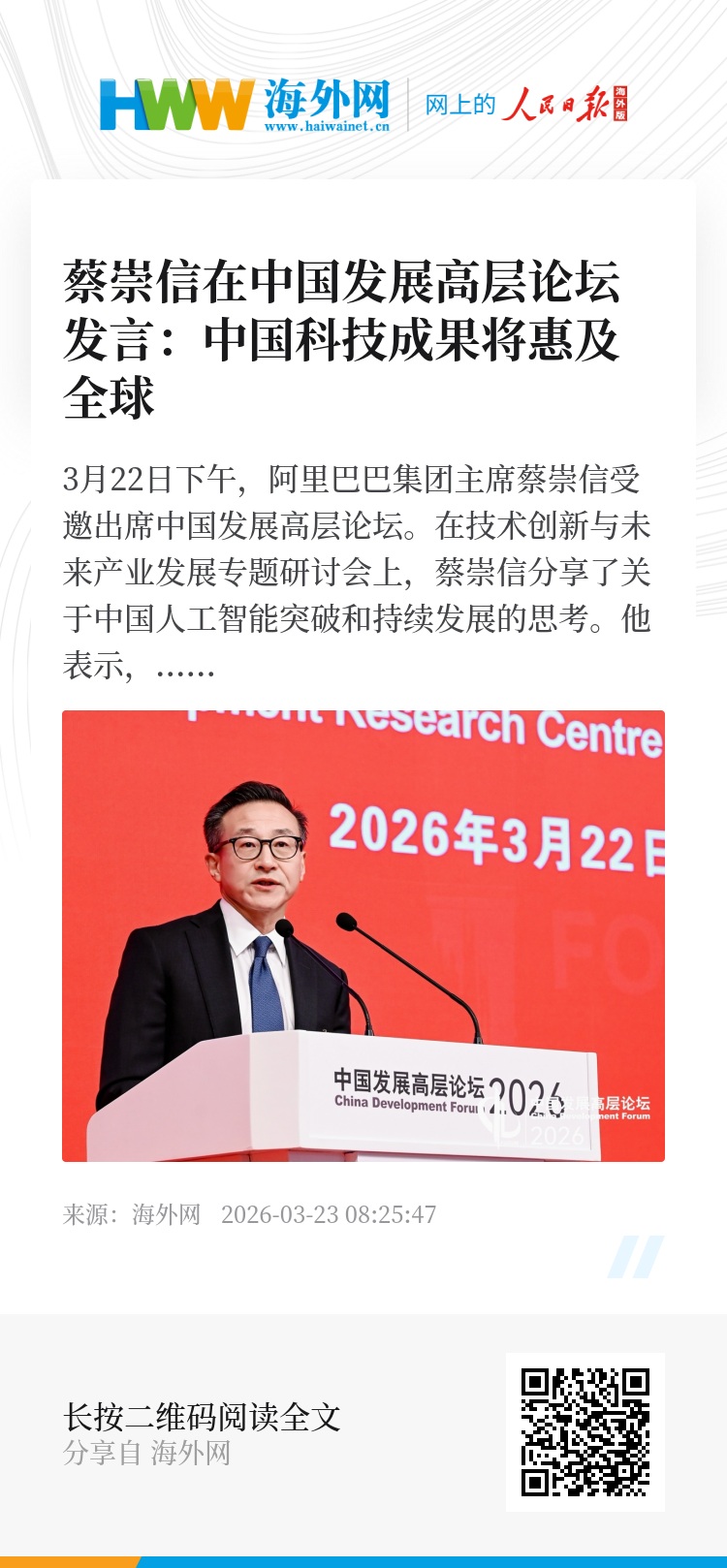(阿里巴巴集团主席蔡崇信受邀在中国发展高层论坛作专题分享)