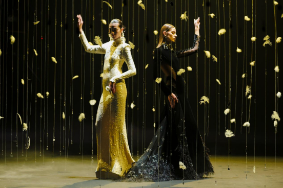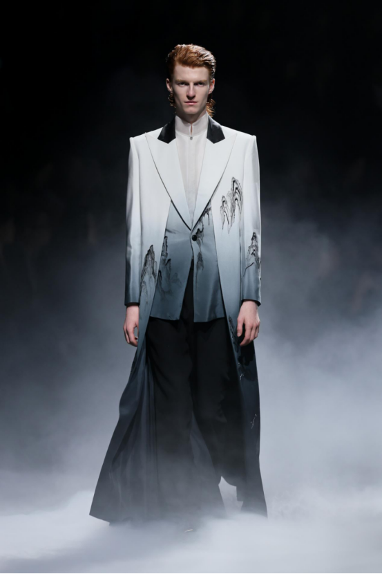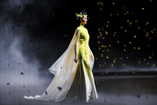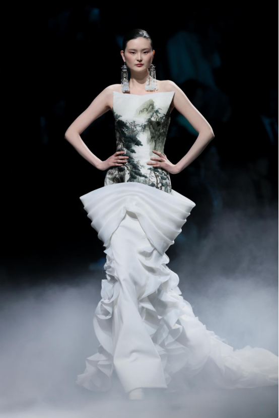 秀场以沉浸式自然意境打造视觉盛宴,灯光与装置交织出空灵浪漫的氛围。设计上延续品牌标志性东方美学,融合苏绣、盘金绣、钉珠等非遗手工技艺,搭配轻盈飘逸的面料与层次丰富的剪裁,将山水意境、花鸟纹样与现代廓形完美结合。色彩清雅素净,既有中式留白的含蓄,亦有当代时尚的璀璨,尽显东方华服的雅致与气场。