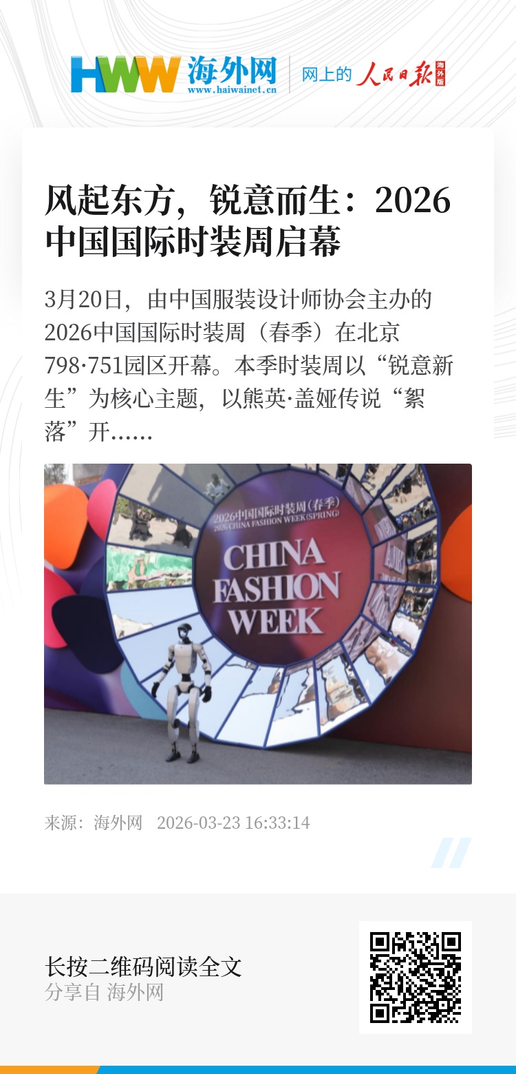 风已至,幕已启。中国国际时装周作为国家级时尚产业平台,始终引领行业方向,致力国际化行业资源整合与创新生态构建,是全球时尚产业的重要枢纽。以“锐意新生”之名,2026中国国际时装周(春季)与所有中国时尚的创造者、参与者、见证者一起,共赴新程。(图由中国国际时装周组委会提供)