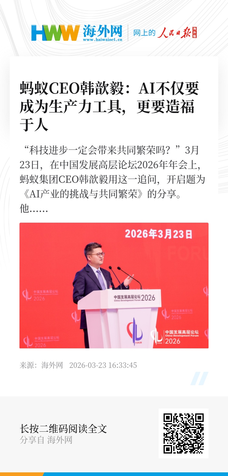 “科技进步一定会带来共同繁荣吗?”3月23日,在中国发展高层论坛2026年年会上,蚂蚁集团CEO韩歆毅用这一追问,开启题为《AI产业的挑战与共同繁荣》的分享。他认为,AI应用不仅是生产力工具,更要造福于人,但要确保AI带来共同繁荣,产业界需要携手应对,共同探索解决方案。