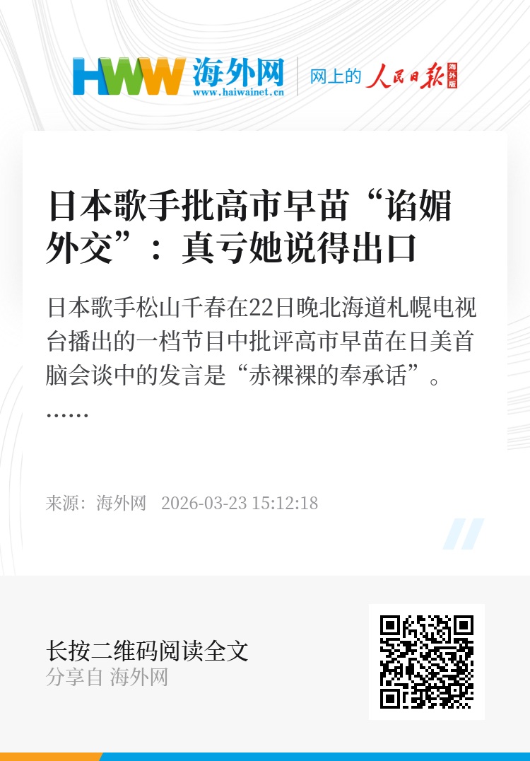海外网3月23日电 日本歌手松山千春在22日晚北海道札幌电视台播出的一档节目中批评高市早苗在日美首脑会谈中的发言是“赤裸裸的奉承话”。