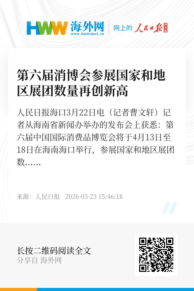 人民日报海口3月22日电(记者曹文轩)记者从海南省新闻办举办的发布会上获悉:第六届中国国际消费品博览会将于4月13日至18日在海南海口举行,参展国家和地区展团数量再创新高,全球消费精品展示交易功能明显增强。