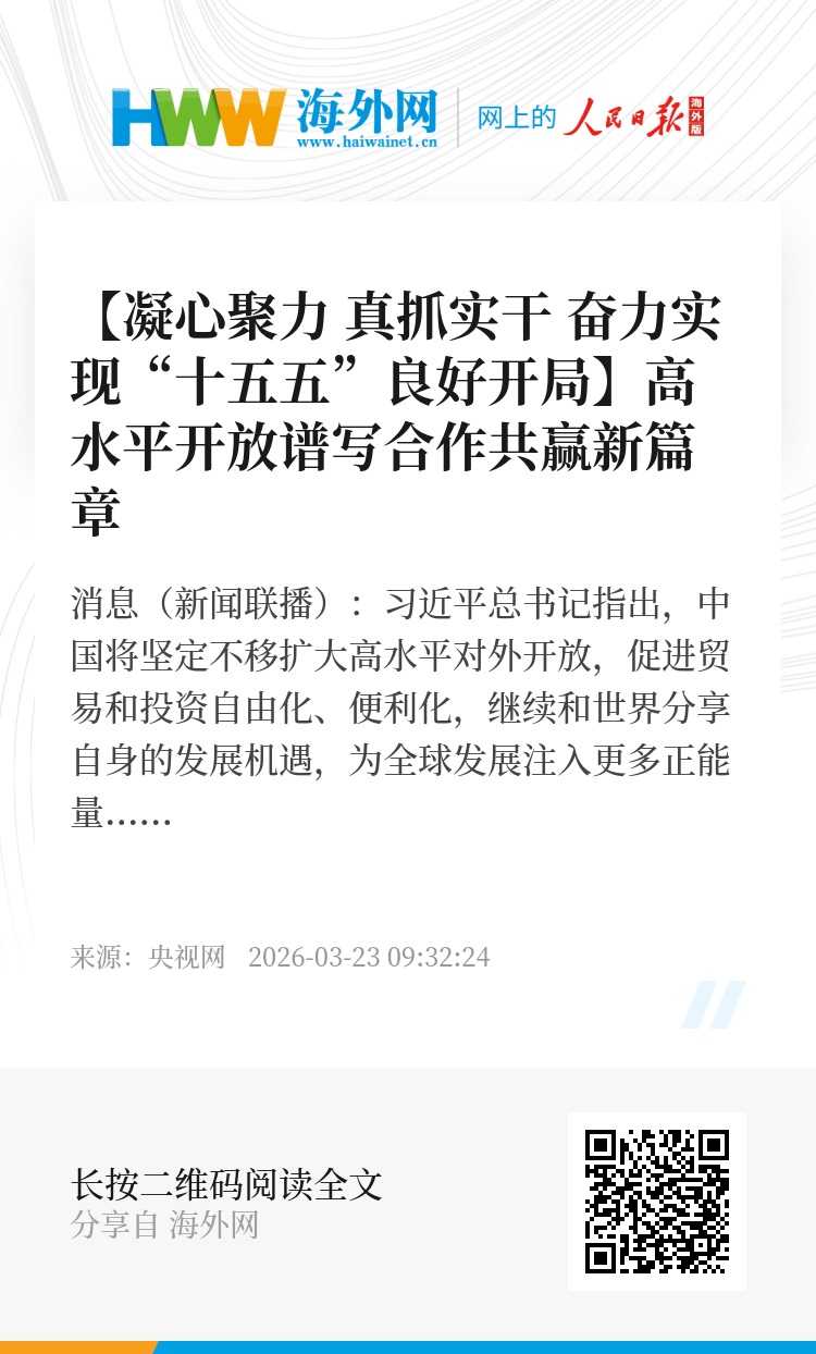 2026年是“十五五”开局之年,在部署今年经济工作时,习近平总书记指出,要坚持对外开放,推动多领域合作共赢。今年全国两会上总书记强调,要扩大高水平对外开放,广泛开拓全球市场,更好联通国际循环。一系列重要论述彰显了中国坚定不移推进开放合作的决心和信心。