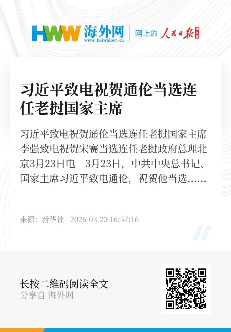 新华社北京3月23日电 3月23日,中共中央总书记、国家主席习近平致电通伦,祝贺他当选连任老挝国家主席。