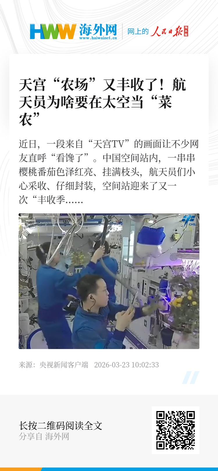 近日,一段来自“天宫TV”的画面让不少网友直呼“看馋了”。中国空间站内,一串串樱桃番茄色泽红亮、挂满枝头,航天员们小心采收、仔细封装,空间站迎来了又一次“丰收季”。