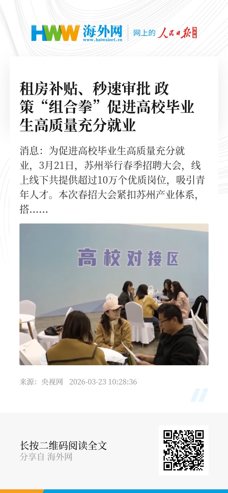 央视网消息:为促进高校毕业生高质量充分就业,3月21日,苏州举行春季招聘大会,线上线下共提供超过10万个优质岗位,吸引青年人才。