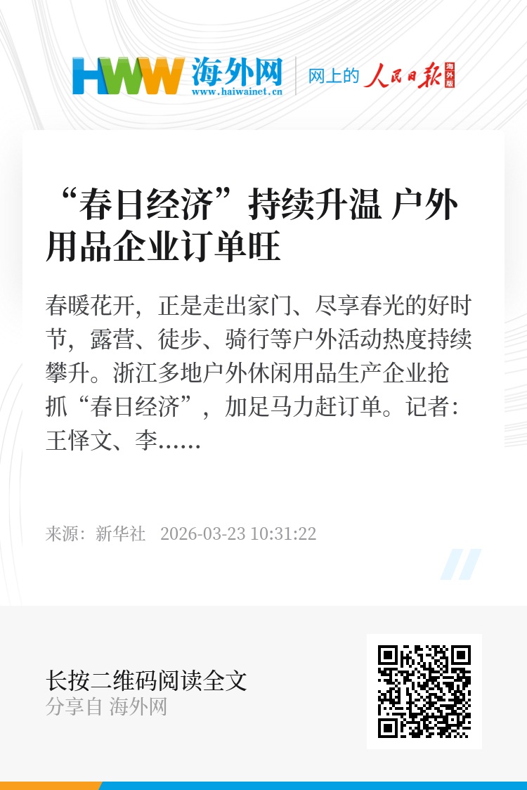 春暖花开,正是走出家门、尽享春光的好时节,露营、徒步、骑行等户外活动热度持续攀升。浙江多地户外休闲用品生产企业抢抓“春日经济”,加足马力赶订单。
