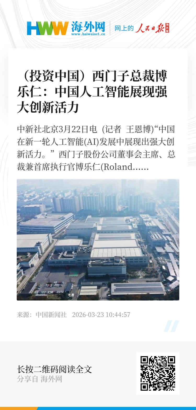 中新社北京3月22日电 (记者 王恩博)“中国在新一轮人工智能(AI)发展中展现出强大创新活力。”西门子股份公司董事会主席、总裁兼首席执行官博乐仁(Roland Busch)近日接受中新社记者采访时表示,来华发展150多年后,这家德国工业巨头又“解锁”了与中国深化合作的新空间。