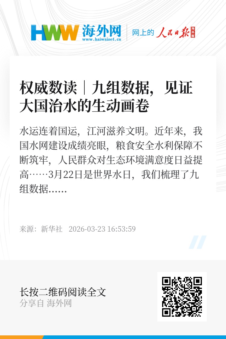 水运连着国运,江河滋养文明。近年来,我国水网建设成绩亮眼,粮食安全水利保障不断筑牢,人民群众对生态环境满意度日益提高……3月22日是世界水日,我们梳理了九组数据,一起跟随海报,见证大国治水的生动画卷,共览人水和谐的时代新篇。