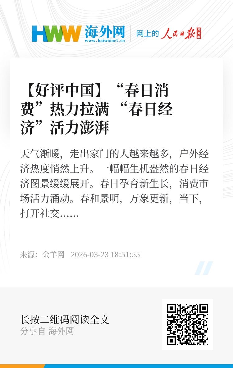 春日孕育新生长,消费市场活力涌动。春和景明,万象更新,当下,打开社交平台,满屏都是网友们晒的踏青“大片”,氛围感直接拉满;旅游平台的数据更直观,赏花游景区门票预订量持续攀升;就连菜市场里,香椿、荠菜、春笋这些时令春菜,也成了市民争抢的香饽饽……连日来,全国各地踏青赏花、采春茶、吃春菜等春季特色体验备受欢迎,带动文旅消费持续升温,“春日经济”活力尽显。从踏青赏花到寻味尝鲜,从徒步骑行到爬山露营,都不乏亮眼的市场数据和消费趋势,彰显出春日经济的供需两旺、活力十足,为美好生活增添了更多色彩,也为经济社会发展注入了勃勃生机。