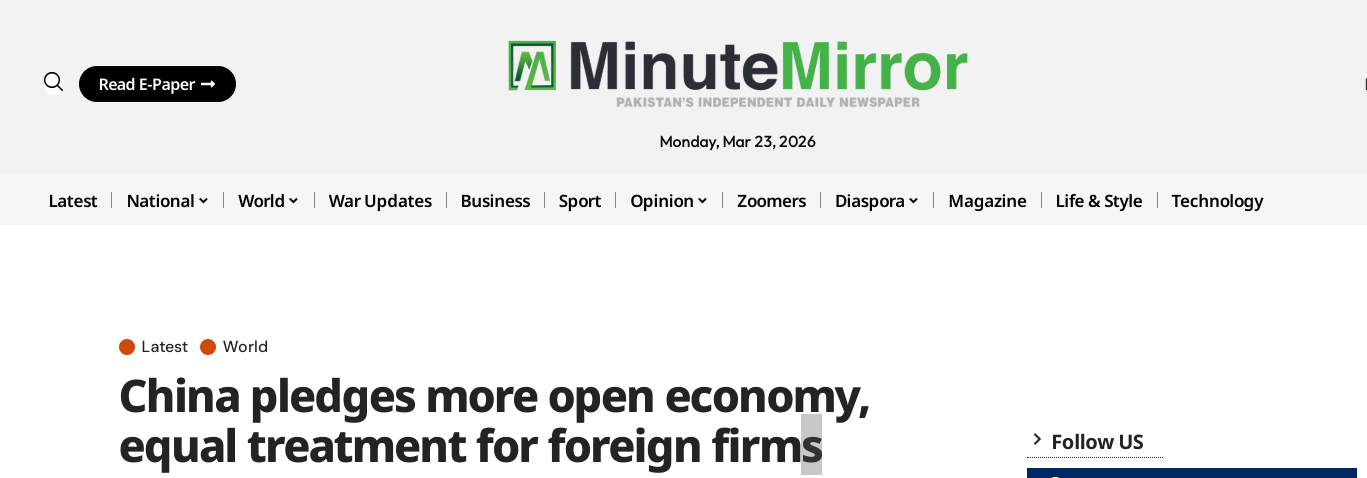 巴基斯坦《分钟镜报》指出,在当前国际经贸形势复杂多变的背景下,中国通过中国发展高层论坛的表态旨在向国际投资者传递稳定预期,彰显中国坚持互利共赢的开放战略。