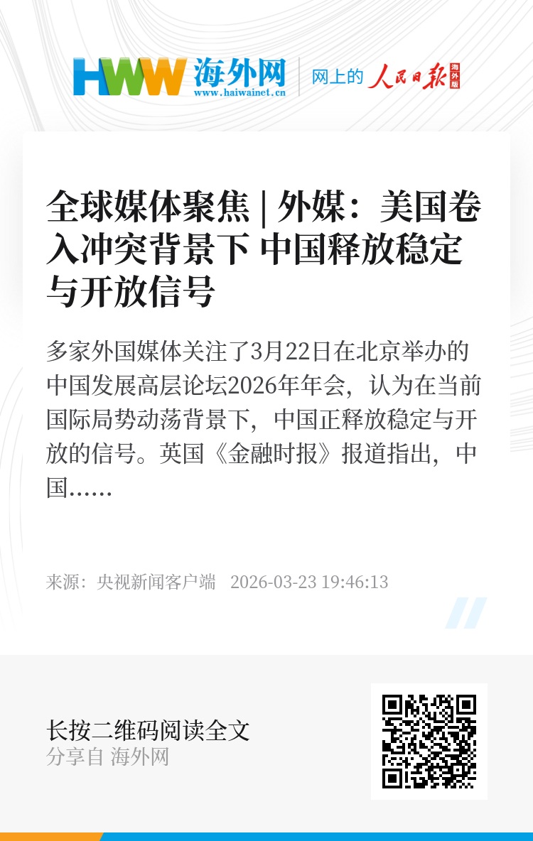 多家外国媒体关注了3月22日在北京举办的中国发展高层论坛2026年年会,认为在当前国际局势动荡背景下,中国正释放稳定与开放的信号。