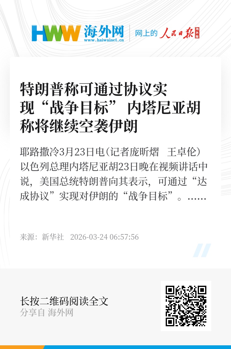 新华社耶路撒冷3月23日电(记者庞昕熠 王卓伦)以色列总理内塔尼亚胡23日晚在视频讲话中说,美国总统特朗普向其表示,可通过“达成协议”实现对伊朗的“战争目标”。内塔尼亚胡在讲话中还说,以色列将“继续空袭伊朗和黎巴嫩”。