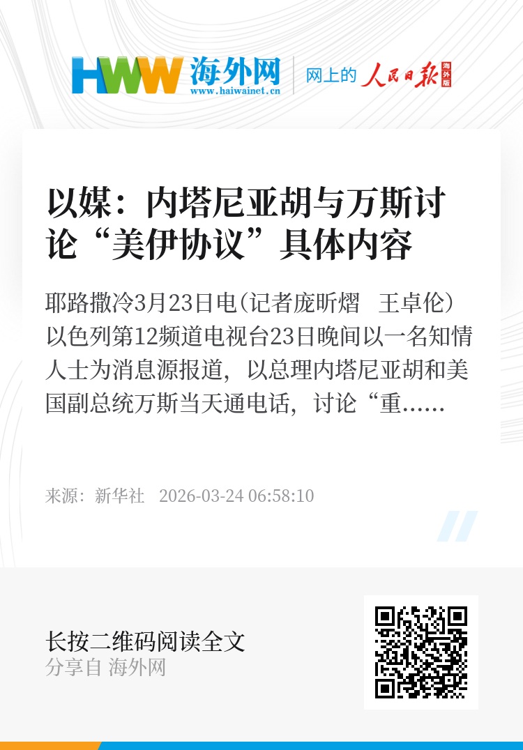 新华社耶路撒冷3月23日电(记者庞昕熠 王卓伦)以色列第12频道电视台23日晚间以一名知情人士为消息源报道,以总理内塔尼亚胡和美国副总统万斯当天通电话,讨论“重启美伊谈判的尝试”。