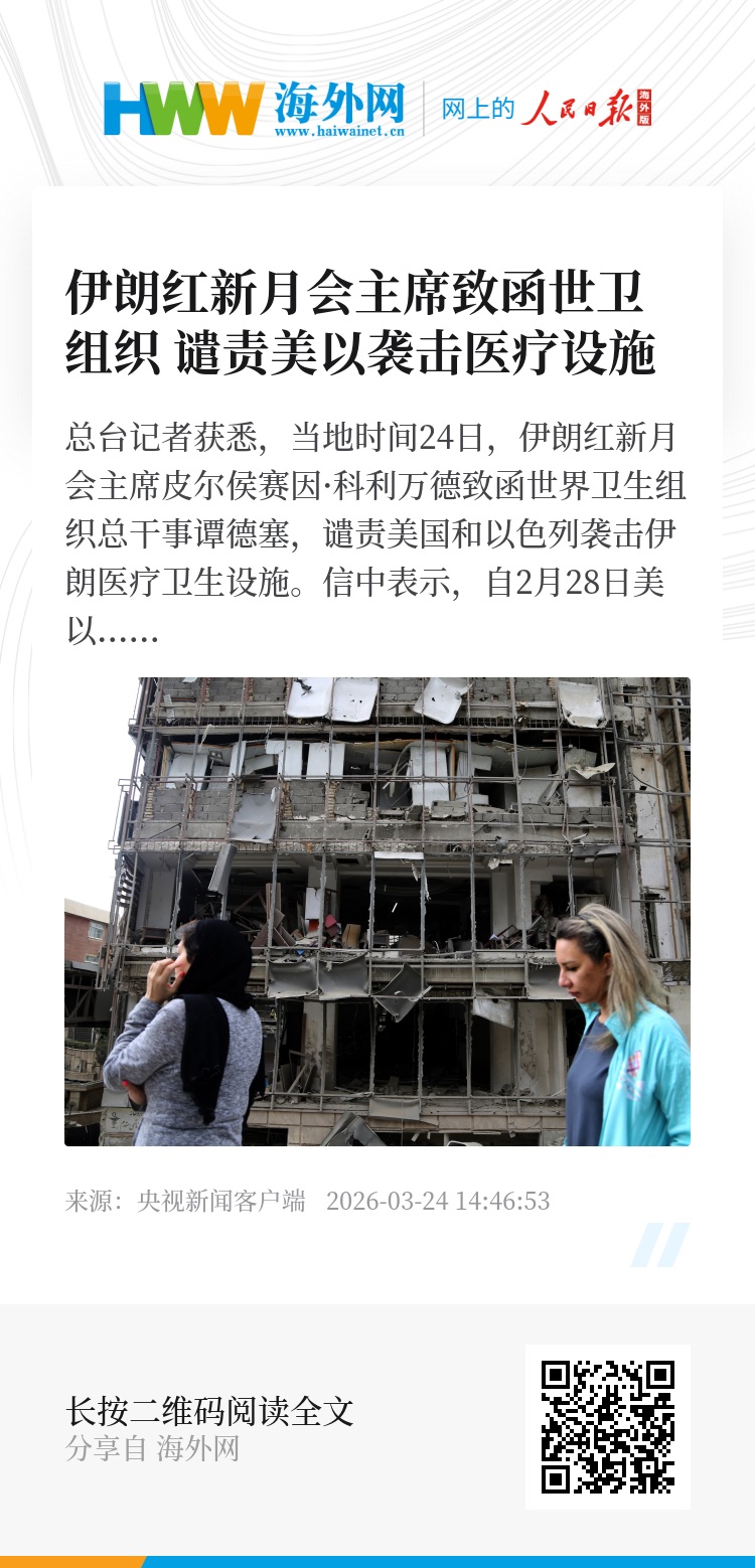 总台记者获悉,当地时间24日,伊朗红新月会主席皮尔侯赛因·科利万德致函世界卫生组织总干事谭德塞,谴责美国和以色列袭击伊朗医疗卫生设施。