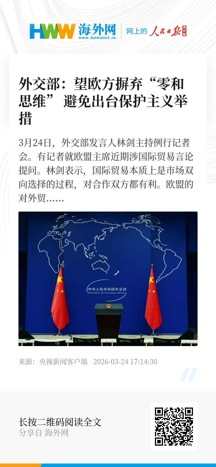 3月24日,外交部发言人林剑主持例行记者会。有记者就欧盟主席近期涉国际贸易言论提问。