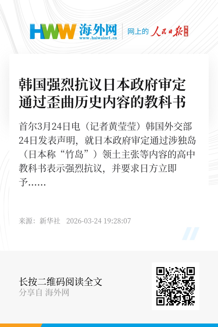 新华社首尔3月24日电(记者黄莹莹)韩国外交部24日发表声明,就日本政府审定通过涉独岛(日本称“竹岛”)领土主张等内容的高中教科书表示强烈抗议,并要求日方立即予以纠正。