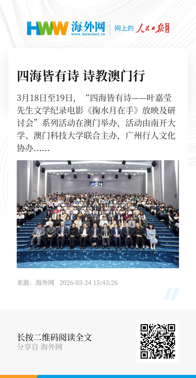 3月18日至19日,“四海皆有诗——叶嘉莹先生文学纪录电影《掬水月在手》放映及研讨会”系列活动在澳门举办,活动由南开大学、澳门科技大学联合主办,广州行人文化协办,并获得澳门教育及青年发展局、澳门天津联谊会、澳门中华诗词学会、南开大学澳门校友会等多家单位支持,诗教澳门行旨在深化澳门与内地文化学术交流,以诗词为纽带,增进澳门各界特别是青年一代对中华文化的认同感与归属感,并深入探讨中华诗教在助力澳门落实国家战略定位中的独特价值与实践路径。
