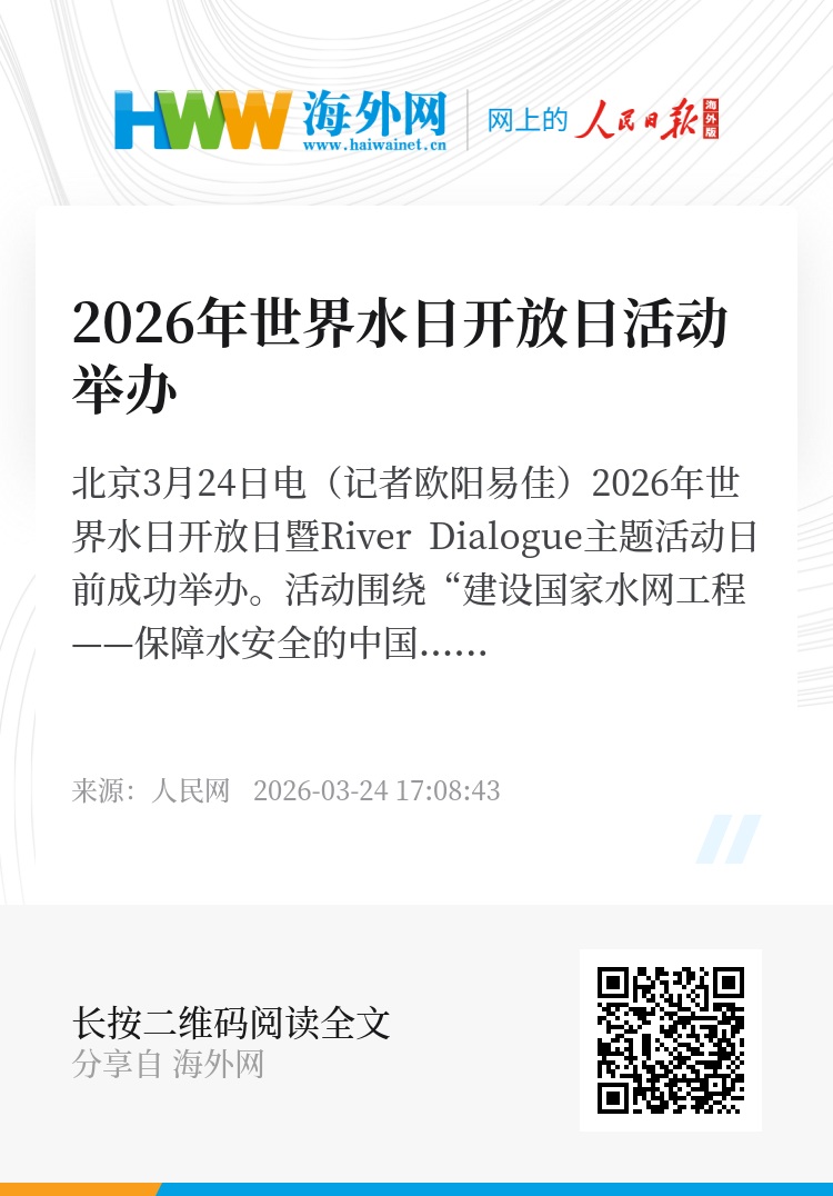 人民网北京3月24日电(记者欧阳易佳)2026年世界水日开放日暨River Dialogue主题活动日前成功举办。活动围绕“建设国家水网工程——保障水安全的中国方案”主题,开展中国国家水网工程政策体系、关键技术和实践经验交流。