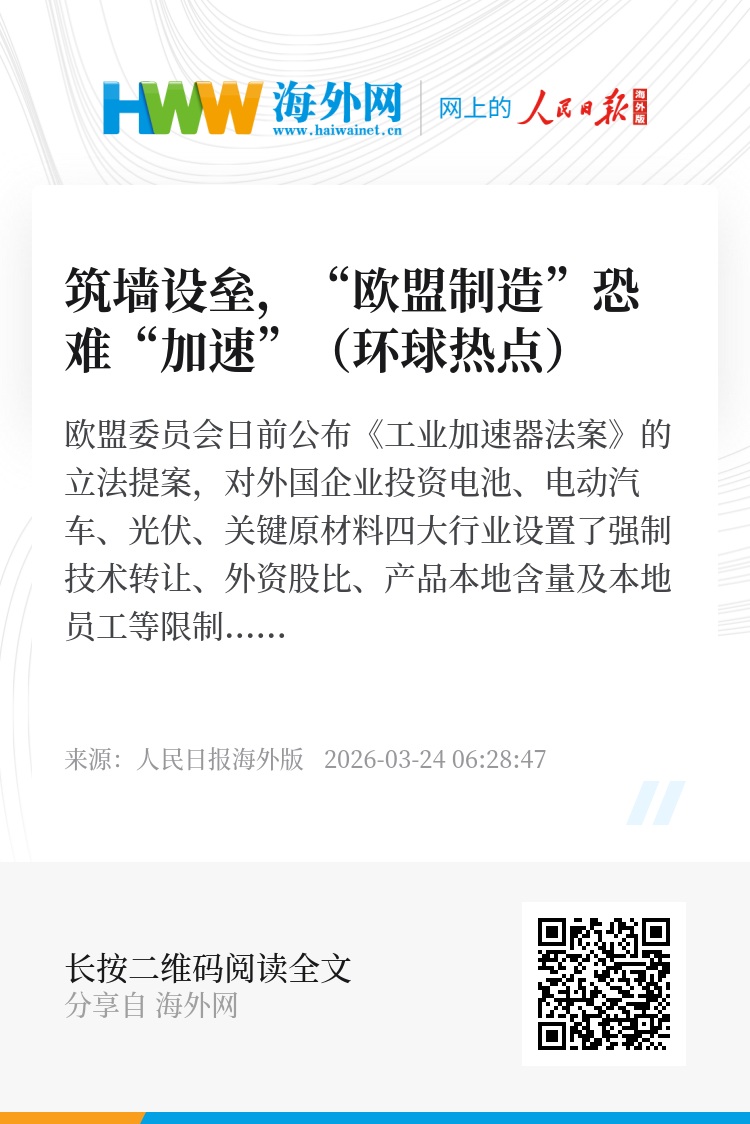 欧盟委员会日前公布《工业加速器法案》的立法提案,对外国企业投资电池、电动汽车、光伏、关键原材料四大行业设置了强制技术转让、外资股比、产品本地含量及本地员工等限制条款,且相关限制仅适用于在上述行业全球产能占比超过40%的第三国投资者,并在公共采购领域明确提出“欧盟制造优先”。