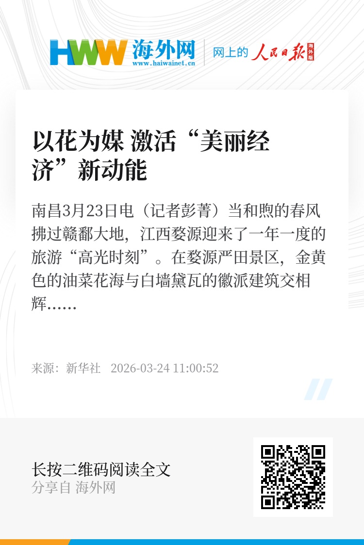 新华社南昌3月23日电(记者彭菁)当和煦的春风拂过赣鄱大地,江西婺源迎来了一年一度的旅游“高光时刻”。在婺源严田景区,金黄色的油菜花海与白墙黛瓦的徽派建筑交相辉映,彩色油菜花的点缀更让这片土地焕发出别样生机。从单纯走马观花到沉浸式深度体验,当地正以花为媒,将生态颜值转化为经济产值,探索“美丽经济”的迭代升级之路,激活乡村振兴的澎湃动能。