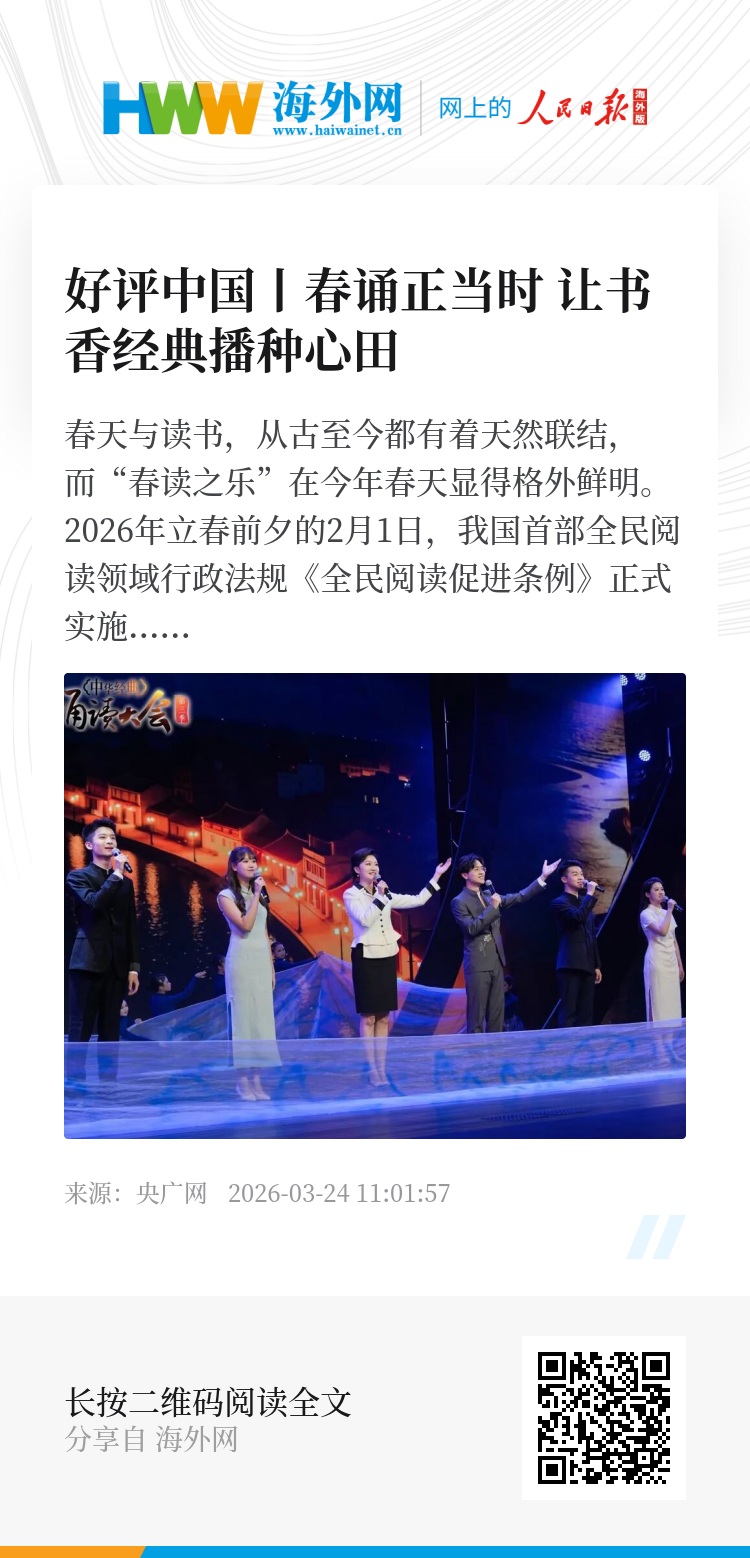 春天与读书,从古至今都有着天然联结,而“春读之乐”在今年春天显得格外鲜明。2026年立春前夕的2月1日,我国首部全民阅读领域行政法规《全民阅读促进条例》正式实施;首个“全民阅读活动周”也将在暮春时节,也就是4月的第四周举行。眼下,全国多地将各种读书诵读活动与节令、政策、教育改革和推进书香社会建设等深度融合,让“春日耕读”不再只是诗意表达,而成为可感可触的全民行动以及人们自然而然的生活方式。