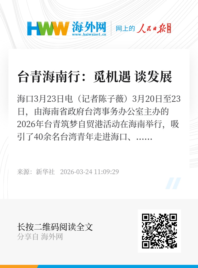 新华社海口3月23日电(记者陈子薇)3月20日至23日,由海南省政府台湾事务办公室主办的2026年台青筑梦自贸港活动在海南举行,吸引了40余名台湾青年走进海口、澄迈等地,在参访交流中探寻发展机遇、加深彼此了解。