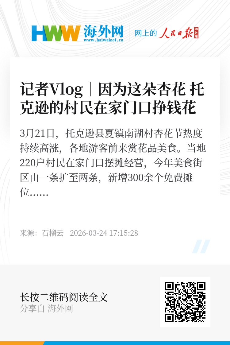 3月21日,托克逊县夏镇南湖村杏花节热度持续高涨,各地游客前来赏花品美食。当地220户村民在家门口摆摊经营,今年美食街区由一条扩至两条,新增300余个免费摊位,有效拓宽村民增收渠道。