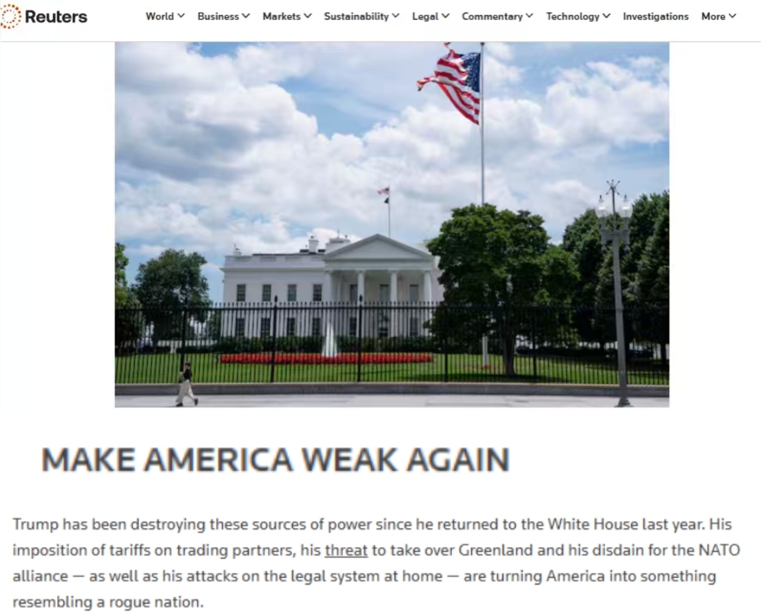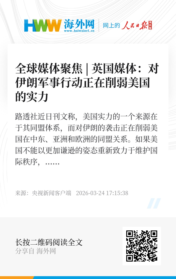 文章认为,美以对伊朗的军事行动正在加速这一进程。可能的情况是,这位曾承诺“让美国再次伟大”的领导人,反而会让美国变得“更加虚弱”。