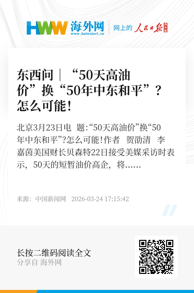 作为世界第一大经济体的财政部长,竟公然抛出“50天高油价”换“50年中东和平”的论调。世界人民无义务为美国的军事冒险买单,武力带不来真正的和平。贝森特此番言论暴露的,是何其荒诞的霸权行径与赌徒逻辑!