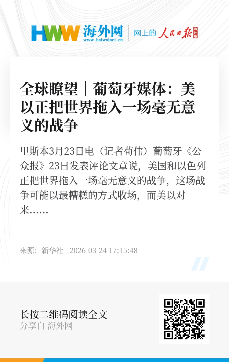 新华社里斯本3月23日电(记者荀伟)葡萄牙《公众报》23日发表评论文章说,美国和以色列正把世界拖入一场毫无意义的战争,这场战争可能以最糟糕的方式收场,而美以对来自各方的批评和一再要求停战的呼声充耳不闻。文章摘要如下: