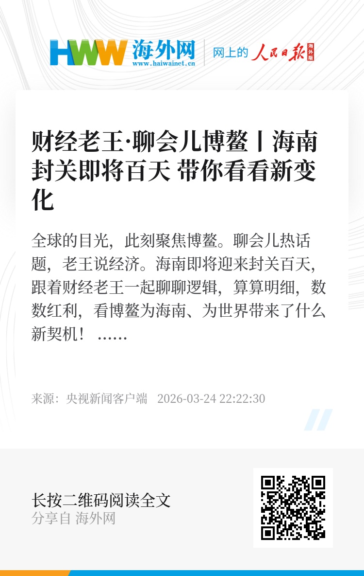 全球的目光,此刻聚焦博鳌。聊会儿热话题,老王说经济。海南即将迎来封关百天,跟着财经老王一起聊聊逻辑,算算明细,数数红利,看博鳌为海南、为世界带来了什么新契机!