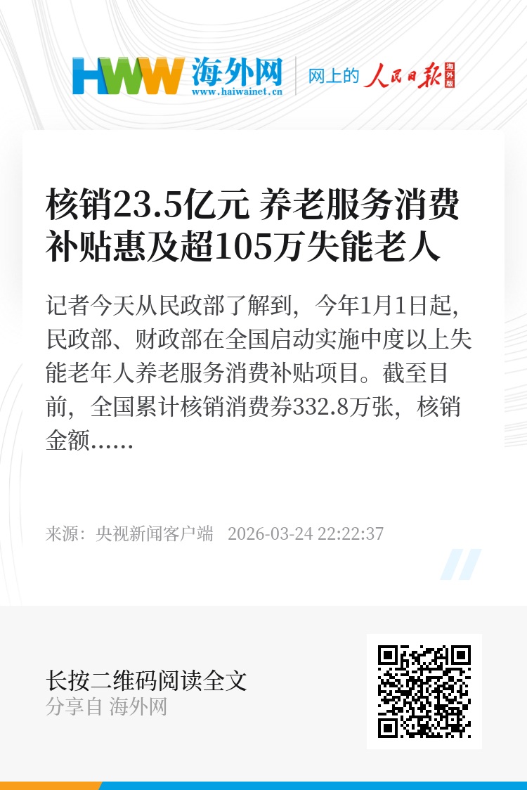 记者今天从民政部了解到,今年1月1日起,民政部、财政部在全国启动实施中度以上失能老年人养老服务消费补贴项目。截至目前,全国累计核销消费券332.8万张,核销金额23.5亿元,带动养老服务消费金额115亿元,超过105万失能老年人从项目中受益。