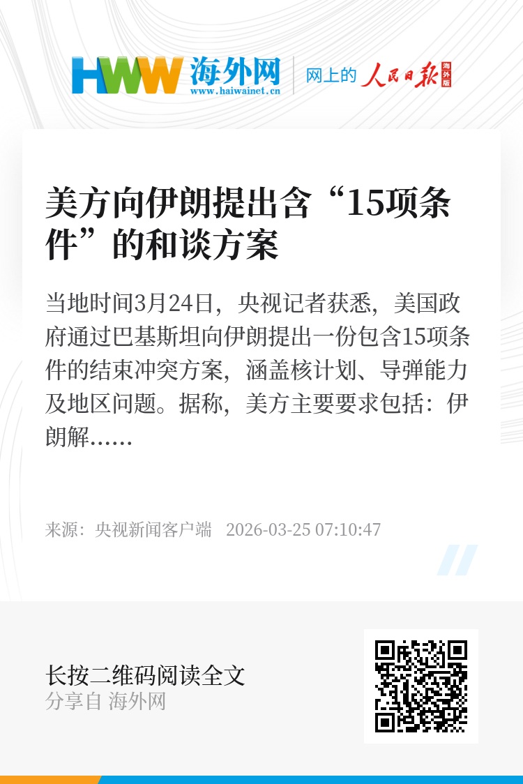 当地时间3月24日,央视记者获悉,美国政府通过巴基斯坦向伊朗提出一份包含15项条件的结束冲突方案,涵盖核计划、导弹能力及地区问题。